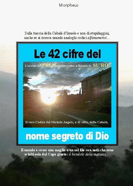 Le 42 cifre del nome segreto di Dio. (3.6.2006) che è quello sintetico che, partendo dalle strampalate premesse del Codice Da Vinci, propone quello dell'Angelo Michele (o Michelangelo) che riconduce il nome segreto di Dio alle 42 cifre (del mio nome). Consiglio di leggerlo, perché è una sintesi completa delle ragioni che mi hanno portato a credere ... di essere l'Eletto (alla Matrix, il che spiega l'autore del libro, chiamato Morpheus)