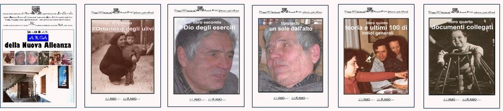 PRIMO: Ortonovo degli Ulivi. (2002) Dalla scrittura di questo libro, scritto dopo l'incidente del 29-1-2002 in cui è stata simultanea la mia tentata estromissione dal mondo e la riuscita trafugazione, invece, del corpo del Cristo, rubato nella stessa ora nella Chiesa di fronte al mio investimento (dopo di averlo staccato dalla grande croce)... che io mi sono accorto, in primis, che ero proprio stato messo "a tu per tu" con la persona di Gesù, e, in secundis, della grandissima coerenza del disegno della mia vita, proprio disegnata in modo che seguisse la stessa trafila di quella del Cristo. Finito il libro, mi sono accorto poi di una cosa assolutamente straordinaria: ad ogni pagina del libro, la Provvidenza (o se preferite "il Caso") che aveva impaginato l'opera, aveva distribuito gli eventi in modo che fossero rappresentati dal numero stesso della pagina. Per farmi capire, quando parlo di una petizione di 460 persone presentata da 4 sacerdoti, per un totale di 464 firme, essa finisce a pagina 464. Allora, senza modificare l'impaginazione, ho ripreso mano all'opera ed ho fatto notare, pagina per pagina, come questo fatto fosse verificato al punto che sembrava un'opera scritta con un assoluto criterio non da me ma da una Superiore Provvidenza! SECONDO, dal titolo "Il Dio degli Eserciti", che ha raccolto: