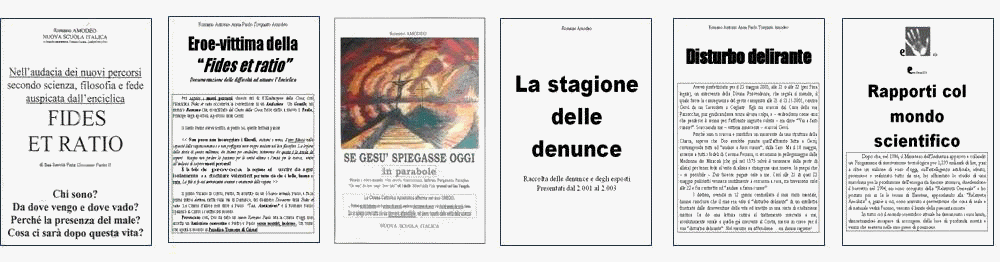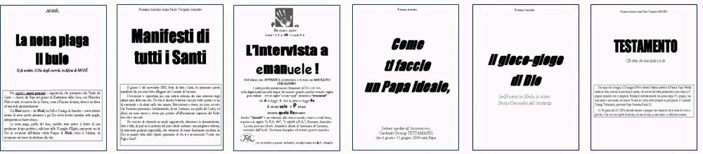 La nona Piaga il buio. (18.1.2004) Manifesti di Tutti i Santi. (1.11.2003) L'intervista a Emanuel. (8.12.2003) Come ti faccio un Papa ideale. (Avvento, 2003) Il gioco-giogo di Dio (scritto dal 1987 al 2003) Testamento. (28.2.2004) QUARTO, dal titolo "Documenti collegati", che ha raccolto: Risposta alla Fides et Ratio (1999) Eroe Vittima della Fides et Ratio (2.000) Se Gesù spiegasse oggi in Parabole. (1.999) La stagione delle denunce. (2003) Disturbo delirante. (2003) Rapporti col mondo scientifico. (2004) Piccola Vetrinetta a colori. (2004) QUINTO, dal titolo "Teoria e ultimi 100 dì":