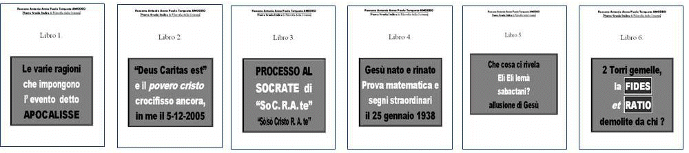 Le varie ragioni che impongono l'evento detto Apocalisse. (2006) La Deus Caritas e il povero cristo ancora crocefisso in me. (2006) Gesù nato e rinato prova matematica. (2006) Processo al Socrate di So CRA te. (2006) Che cosa ci Rivela Eli Eli Lema sabactani (2006) Le due Torri Gemelle, la Fides et Ratio demolite da Chi. (2006)