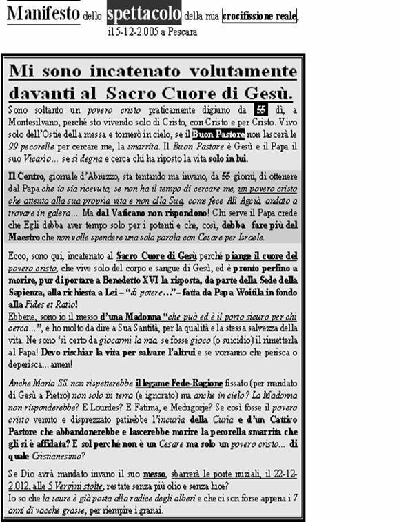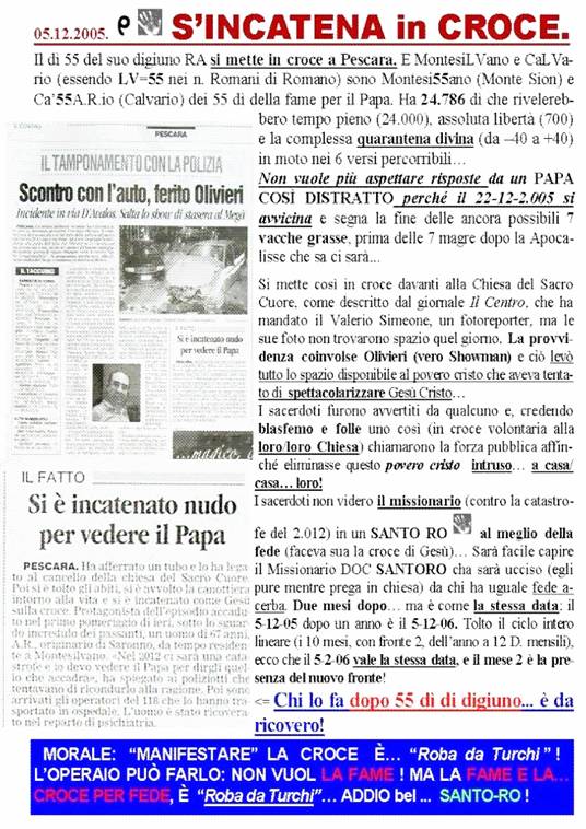 Fu proprio quello che accadde quel giorno in cui l’orologio si fermò a convincermi del ruolo voluto per me da Dio. I primi 64 anni della mia vita sono stati un tempo completo (2^6) di preparazione, affinché io poi fossi convinto … di essere l’Eletto RA Amodeo nato a Felitto e tratto dall’Egitto di Ra Amon…, insomma sia l’Emanuele, sia Israele. La sollecitazione fatta dal Papa ai Filosofi, di prender la parola per trovare un altro percorso, filosofico, verso le verità stesse di Cristo, era datata il 14-9-98, giorno dell’Esaltazione della santa croce. Quando io avevo tentato di rispondere indicendo un Convegno il 24-10-1999, c’era stato (per voler della Provvidenza) il Trasporto e l’esaltazione della Croce proprio a Saronno e tutti i sacerdoti avevano seguito il Cristo di Legno, lasciando me solo, nel desolante abbandono e nella sprezzante noncuranza degna di un Paria realmente “esaltatosi nella sua croce” perché ero volontariamente digiuno da 38 giorni...… Ebbene la Provvidenza divina, il 29-1-2002 mi dimostrò che Dio aveva agito con una priorità assolutamente opposta: che si portasse pure via il corpo di legno di Gesù. ma che si salvasse il mio, espressione reale del Dio vero e vivo, pur se calato nel mio peccato! Era stato per me come il segno di una staffetta, e che il Gesù di legno s’era riversato in quello di carne... |