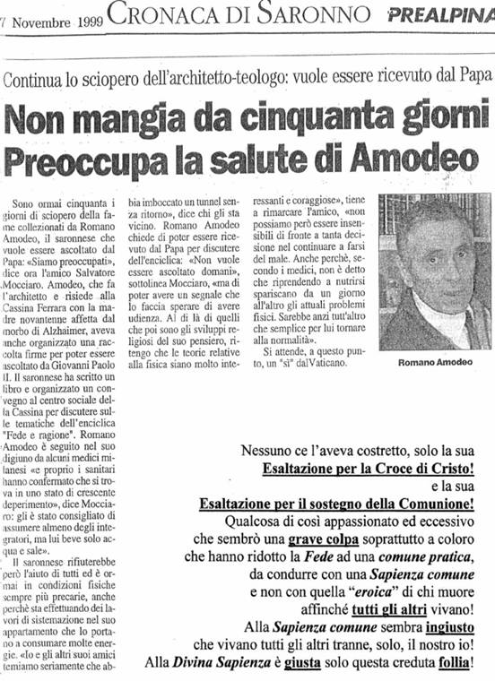 Io avevo digiunato già 57 giorni, nel 1999, per aiutare Papa Woitila, che aveva spinto i Filosofi a trovare il coraggio di occuparsi delle questioni di fede, affinché cercassero una nuova via verso le verità di Gesù, ma, essendo voluto come il Paria della chiesa cattolica, io fui condannato a morte dalla questa chiesa. Potevo morire benissimo ma la chiesa saronnese non aveva alcuna intenzione a portare in alto loco le mie risposte.