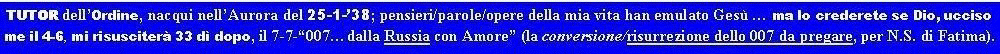 MIA VITA.. Da quando nacque tra luci che andavano di notte da Oriente a Occidente, come lampi nel cielo e durante l'atterraggio del RAID Roma RIO, del Figlio dell'Onnipotente italiano e di quella RACHELE che essa pure è RA che è Ele (nome dato a Dio dagli Ebrei). Questo simbolico Figlio di Jahve l'Onnipotente e di RA (che è Dio) atterra dopo le 22 e io nasco allora, io RIO, in via Pomerio, in una casa con la Sindone disegnata nell'Ingresso e con davanti l'imponente Chiesa dell'Assunta, costruita sulla Roccia (di Pietro) e così imponente da sottomettere la povera casa mia.